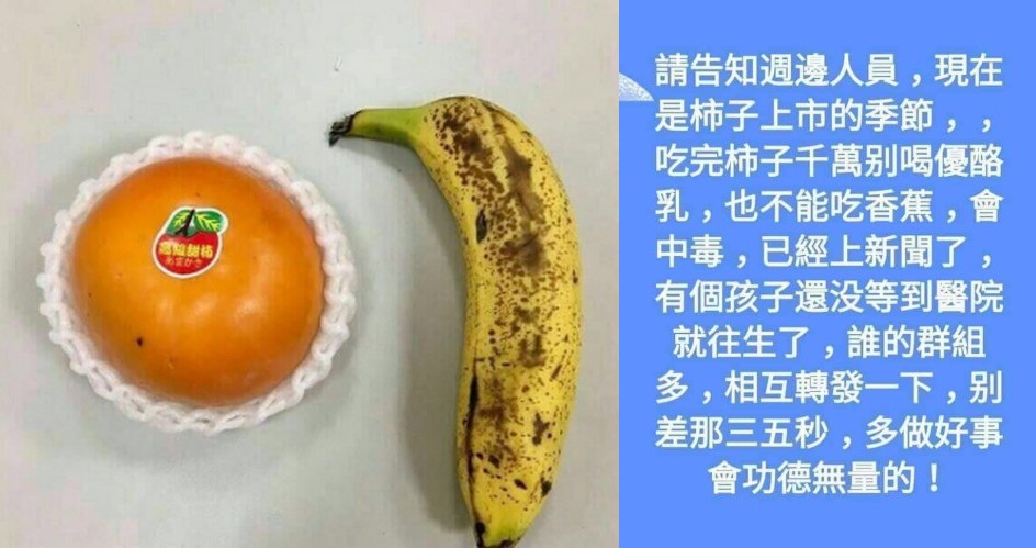 秋天即將到來,隨著季節更替,相關的不實謠言也開始出現在網路上。近日有則網路圖文指出「現在是柿子上市的季節,吃完柿子千萬别喝優酪乳,也不能吃香蕉,會中毒,已經上新聞了,有個孩子還没等到醫院就往生了,誰的群組多,相互轉發一下,别差那三五秒,多做好事會功德無量的!」這是錯誤訊息,以下為查核中心查核結果: