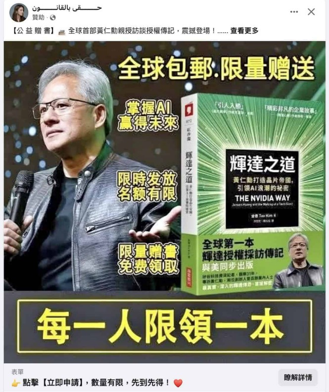 最新詐騙手法請注意!近日臉書上瘋傳一則「免費領取輝達(NVIDIA)執行長黃仁勳傳記」的廣告,內容中表示,只要加入指定的Line帳號就可以了獲取黃仁勳的傳記。雖然乍看之下看似是公益活動,但警方與事實查核中心已證實,這是「假冒名人」的投資詐騙陷阱。