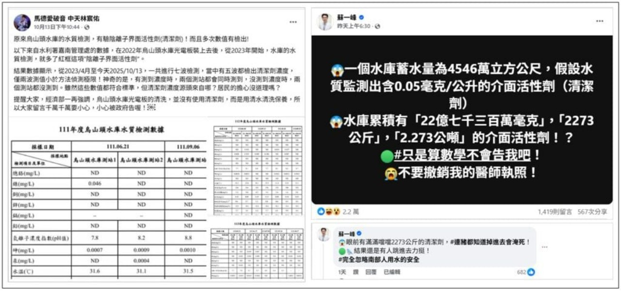 因此,網路社群貼文有關烏山頭水庫驗出「清潔劑濃度」、「濃度等同2273公斤清潔劑」等說法,均屬引用片面資料進行錯誤推論,是不實造謠。