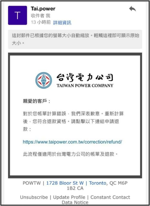 又有假冒官方郵件的新型詐騙出現!近期有民眾收到自稱來自台電的電子郵件,文中聲稱「因帳單計算錯誤將退費給用戶,並要求點擊信中連結輸入信用卡號等個資」。這是冒用台電名義的詐騙郵件,以下為事實查核中心的查核結果: