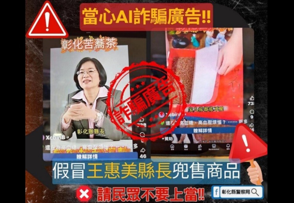 由於AI生成軟體普及,也因此成為詐騙集團的犯罪工具,近日已接連有彰化縣長王惠美、苗栗縣長鍾東錦,遭盜用肖像以AI生成影片推薦健康茶商品,引發關注!
