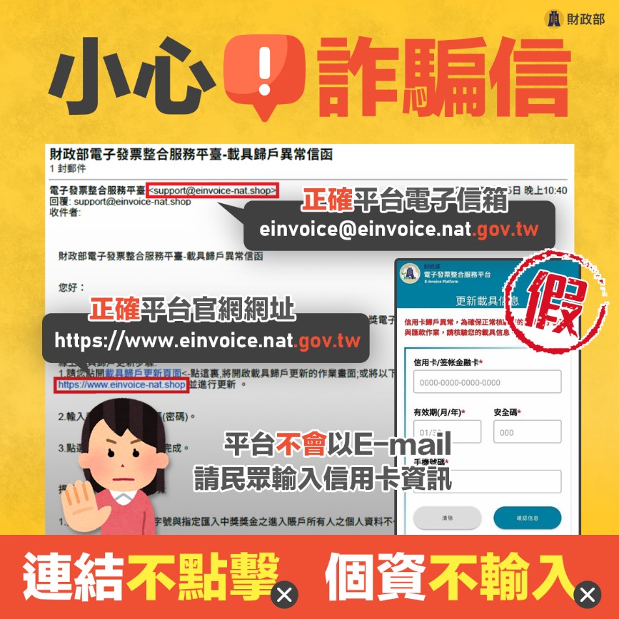 對此,財政部已透過不同管道宣導:「財政部電子發票整合服務平台電子信箱及官網網址結尾為政府專用.gov.tw」,且「官方平台不會寄送E-mail要求民眾輸入信用卡資訊」。呼籲民眾一定要提高警覺,不明連結不點擊,切勿輕易在網路上輸入任何金融個資。