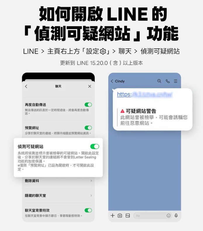 LINE是台灣目前最多民眾頻繁使用的通訊軟體,但也經常被詐騙集團利用,成為詐騙犯罪的工具。為了降低用戶遭到詐騙的機率,LINE官方近日推出了「偵測可疑網站」的功能,當聊天室出現可疑連結時,系統會跳出「可疑網站警告」,在用戶點擊連結前提供警示。