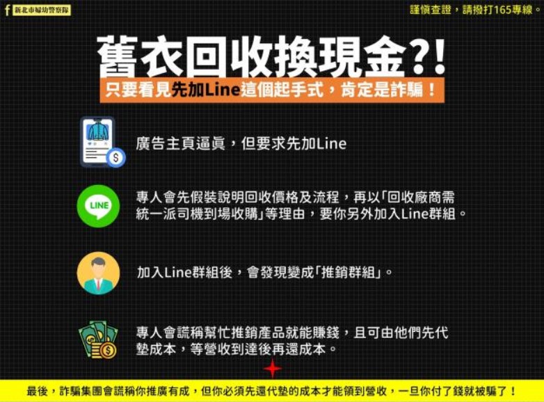 被害人滑手機時在網路上看到一則「舊衣回收換現金」的廣告,加入相關群組後,對方表示要先繳 3,000 元成本費,才能進行作業。