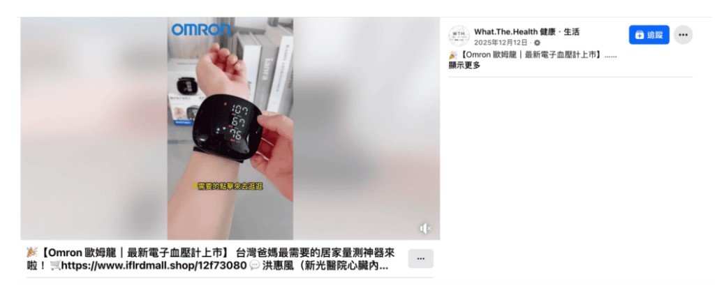 近日網路社群平台出現醫療器材廣告文,文中推銷一款由台灣心臟科名醫洪惠風所推薦的血壓計。由於網址是一頁式購物連結,疑似為購物詐騙,對此事實查核中心做出以下查核:
