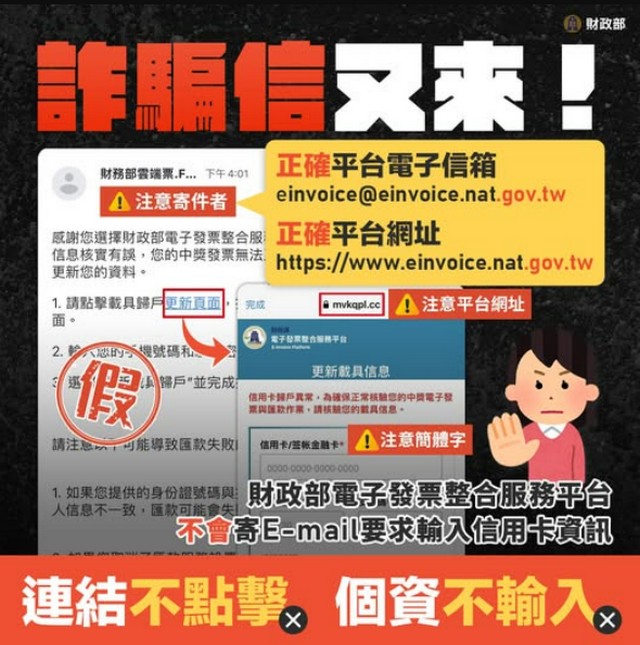 被害人事後查證,才知道真正的財政部電子發票整合服務平台不會以電子郵件要求提供信用卡完整資料,更不會要求輸入OTP驗證碼。也發現最近詐騙集團常以「中獎通知」誘騙民眾點擊假網址,藉此竊取個資及金融資訊,很後悔當初沒有多做查證,就貿然點進連結輸入相關金融個資。